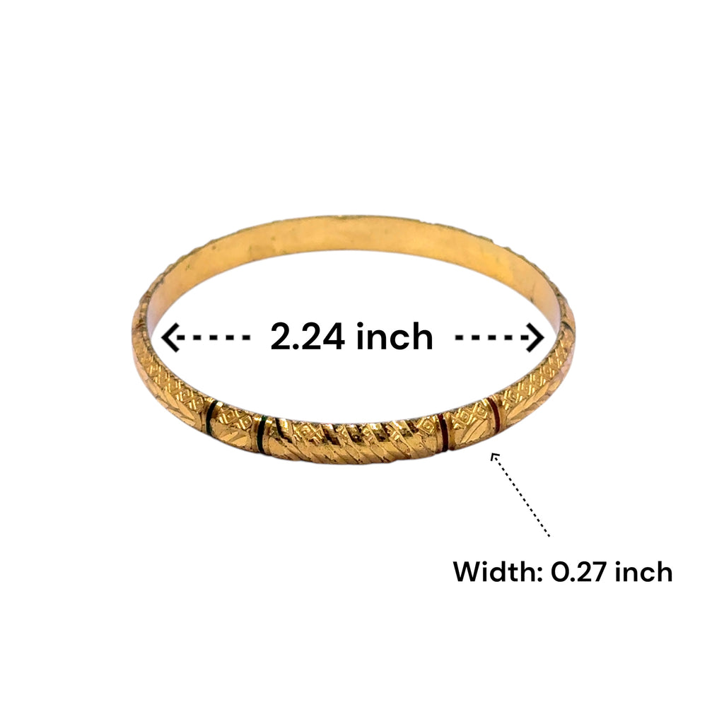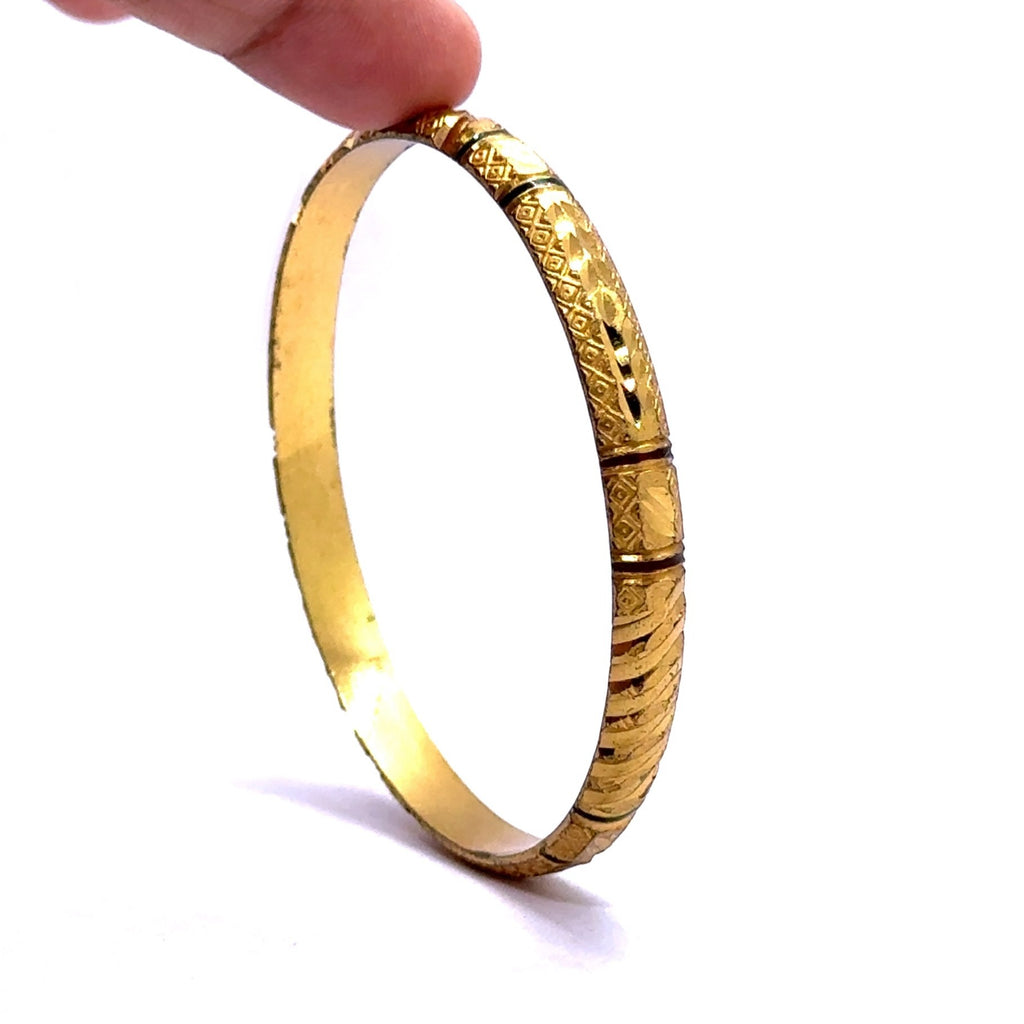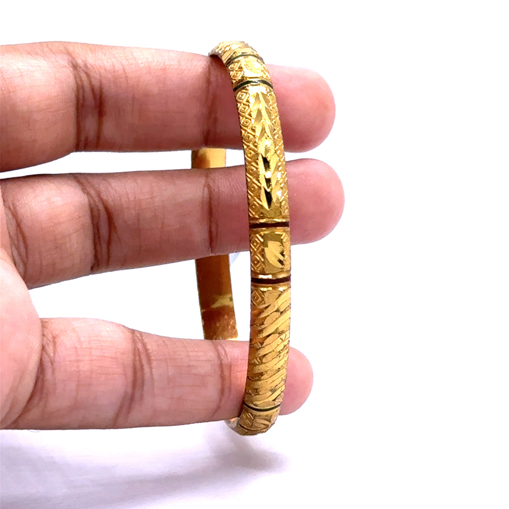Celebrate timeless tradition with this exquisitely engraved bangle. Crafted on a luminous yellow gold plated base, this piece is adorned with intricate and symmetrical geometric textures that evoke a rich sense of cultural artistry. The masterful engravings are accentuated to create a striking visual depth and a powerful, heritage-inspired feel. Perfect as a captivating standalone statement or as the bold anchor for a curated bangle stack, this beautiful accessory is a testament to meticulous craftsmanship and classic ethnic design.