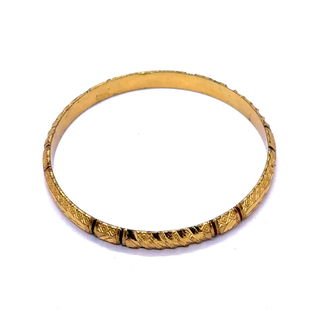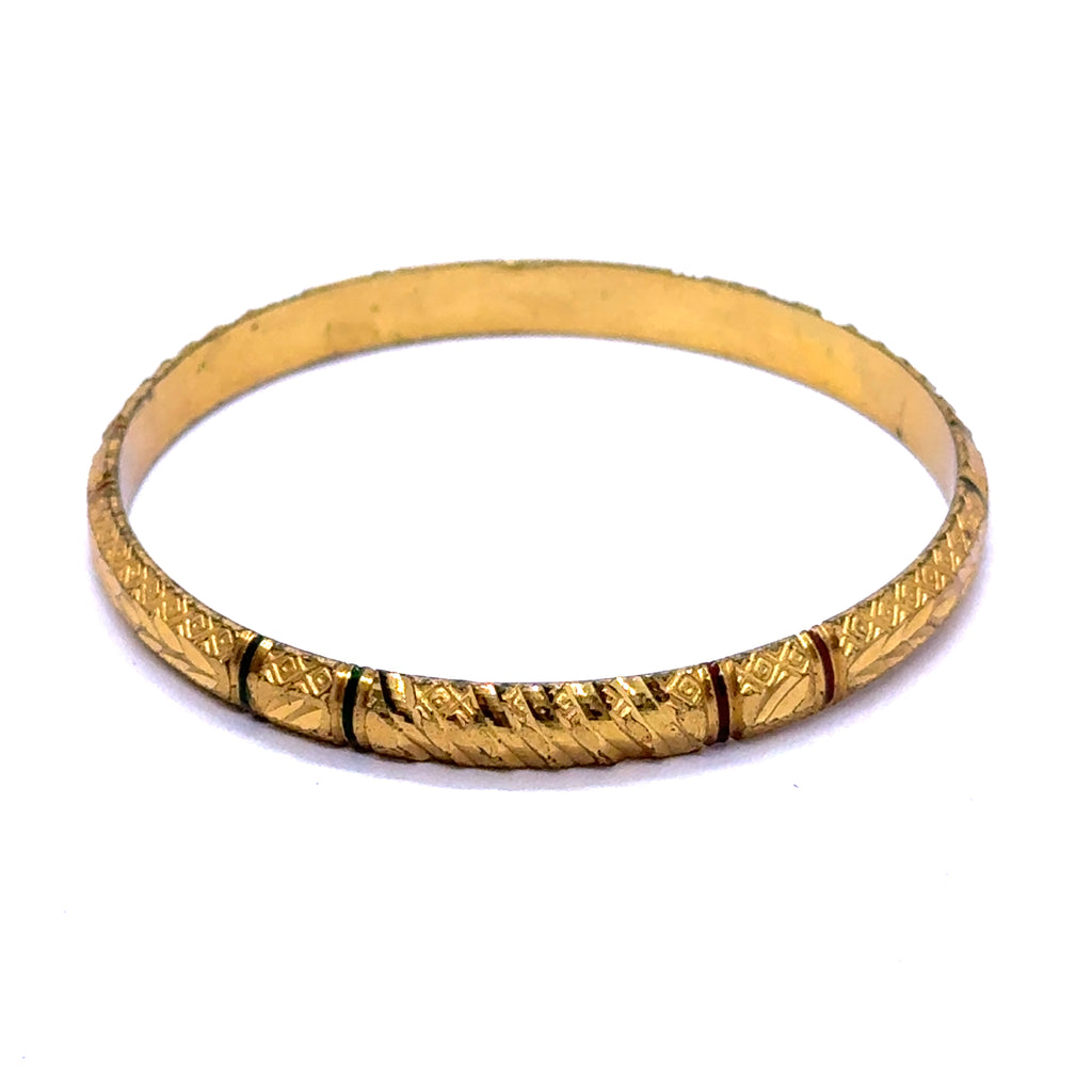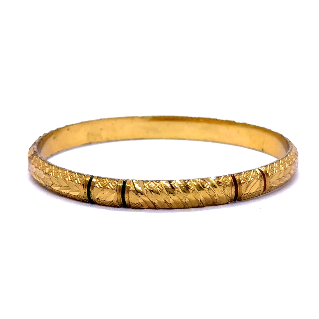 Celebrate timeless tradition with this exquisitely engraved bangle. Crafted on a luminous yellow gold plated base, this piece is adorned with intricate and symmetrical geometric textures that evoke a rich sense of cultural artistry. The masterful engravings are accentuated to create a striking visual depth and a powerful, heritage-inspired feel. Perfect as a captivating standalone statement or as the bold anchor for a curated bangle stack, this beautiful accessory is a testament to meticulous craftsmanship and classic ethnic design.