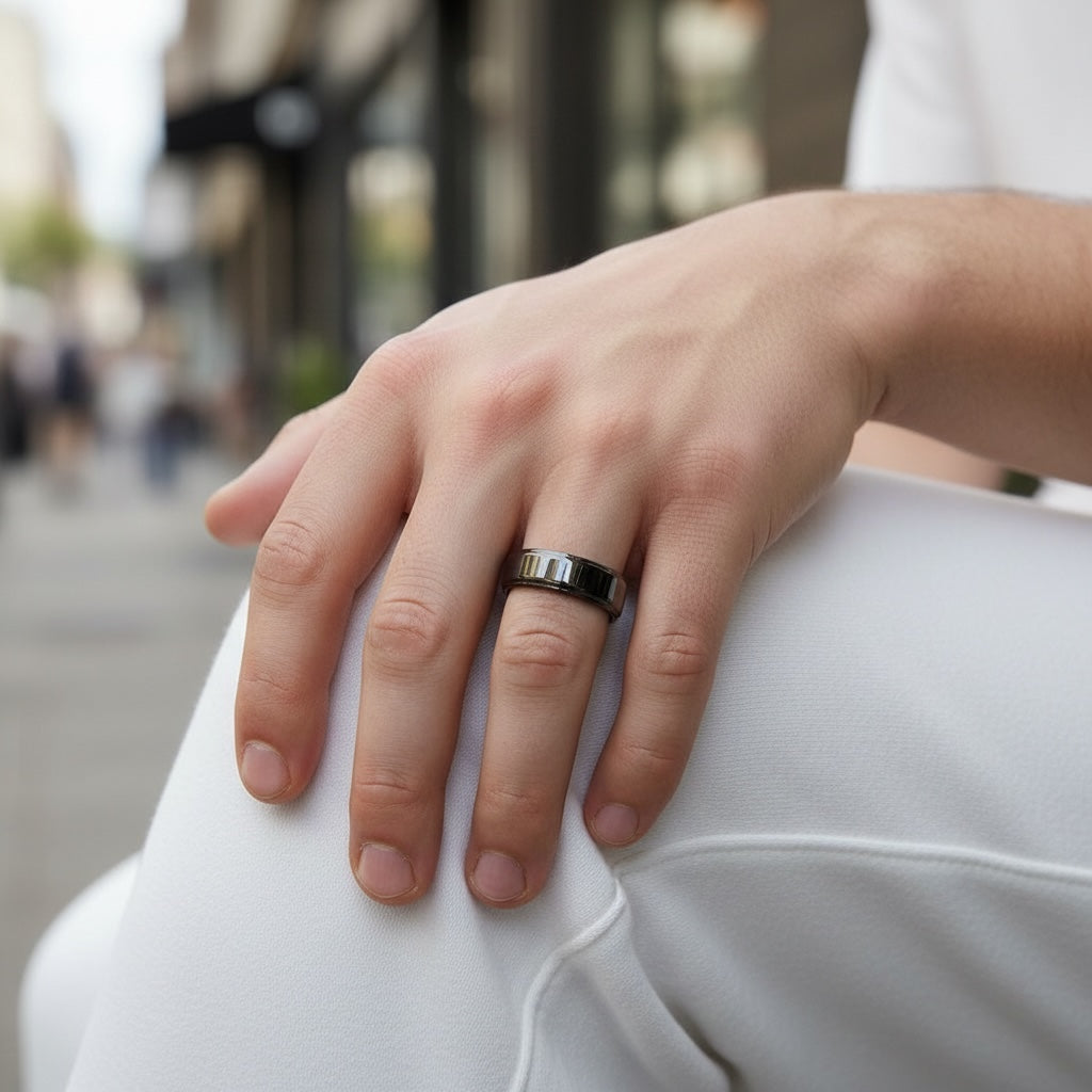 JEWELNJOY's polished silver tungsten band with stepped edges combines mirror shine with crisp detail for a modern, structured finish.