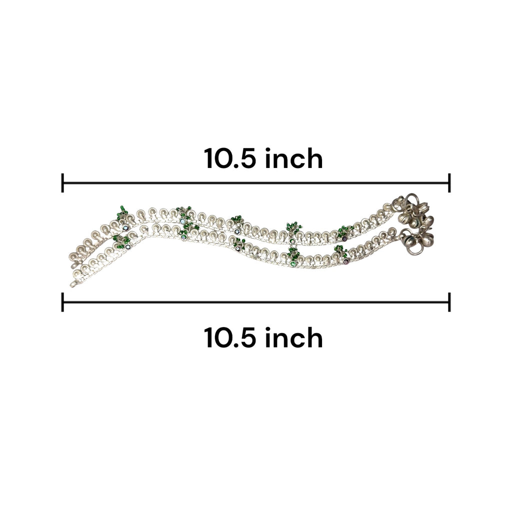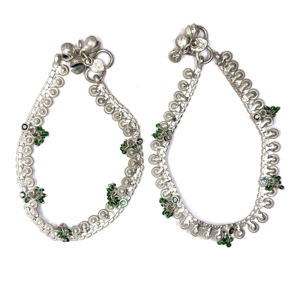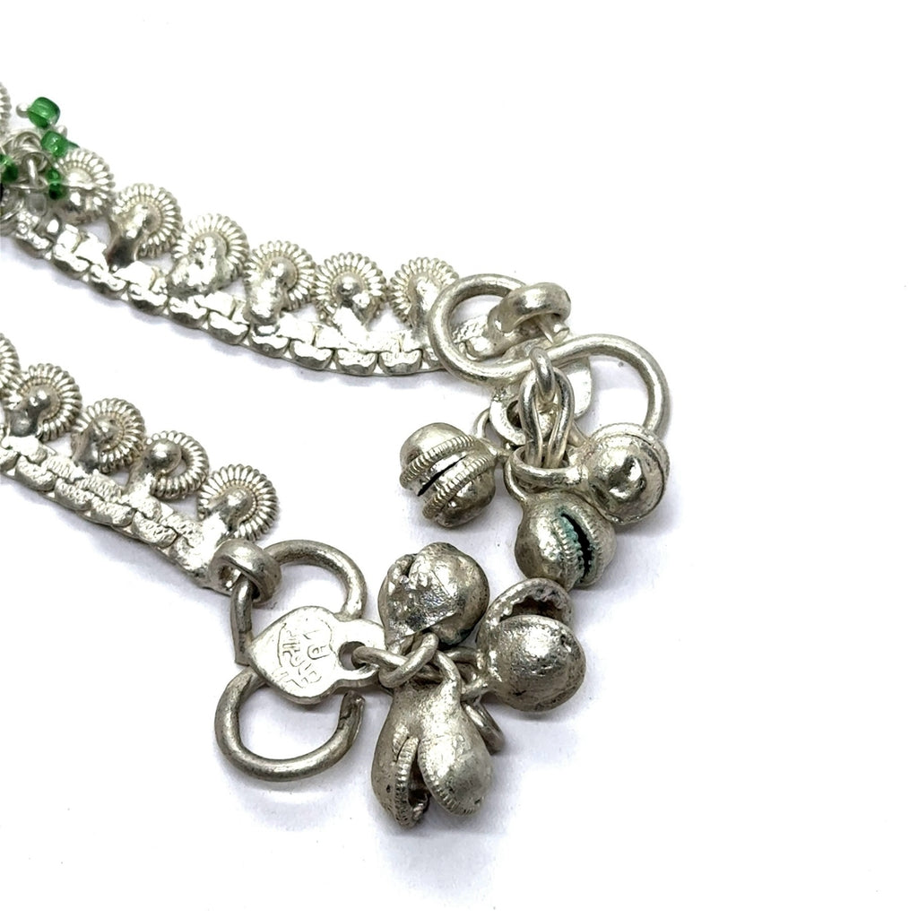 Celebrate unique bohemian style with this stunning pair of German silver anklets. These artfully crafted anklets feature an intricately woven chain design, creating a rich texture that is beautifully complemented by vibrant green beads set at intervals. The oxidized finish of the German silver lends a touch of vintage, artisanal charm to the piece. Perfect for expressing your inner free spirit, this pair adds a bold and earthy elegance to any look, making it a distinctive and eye-catching accessory for any occasion.