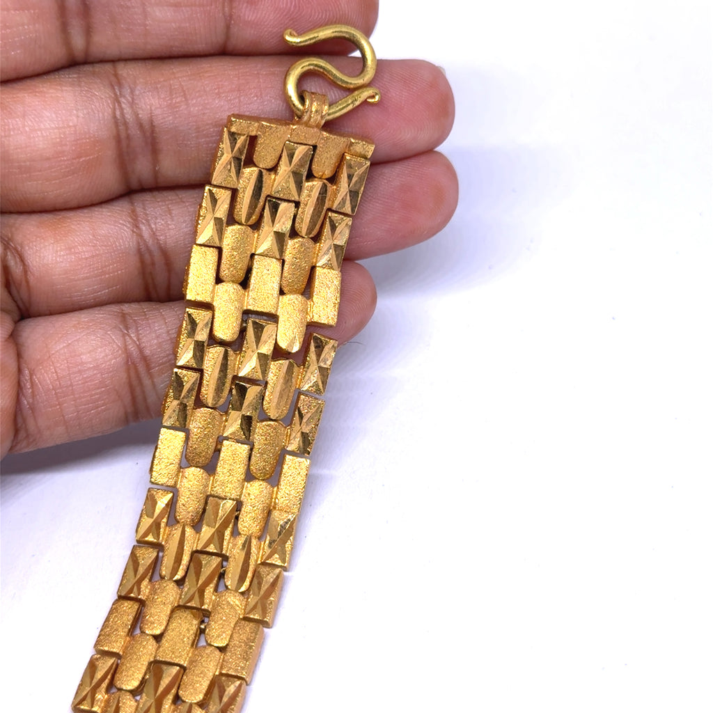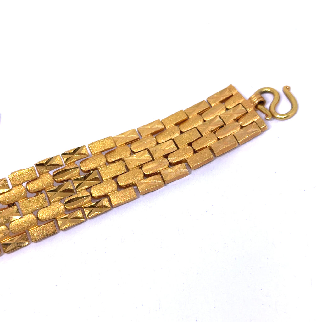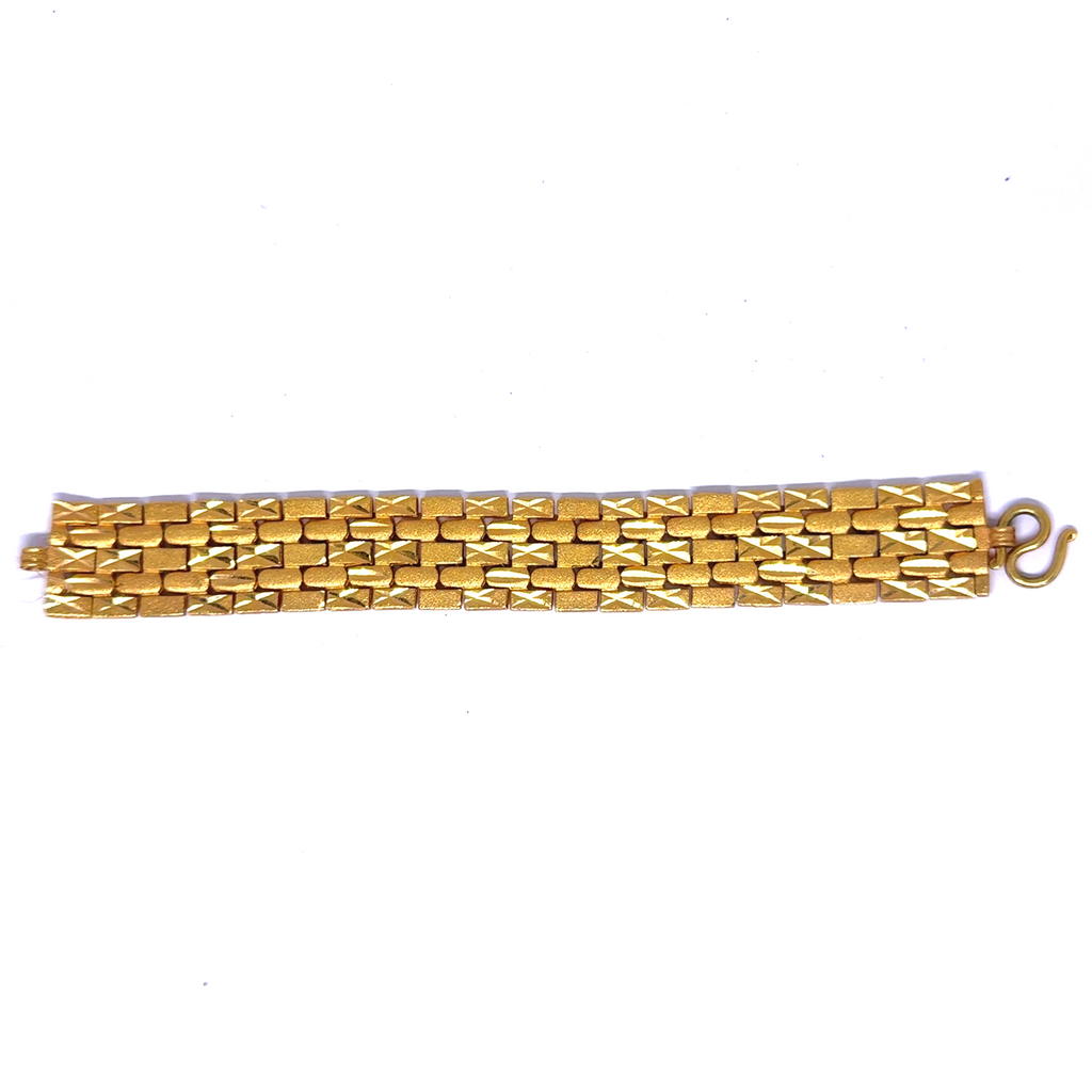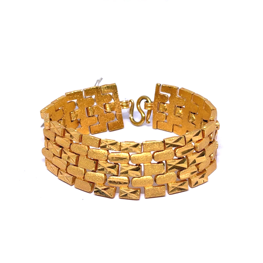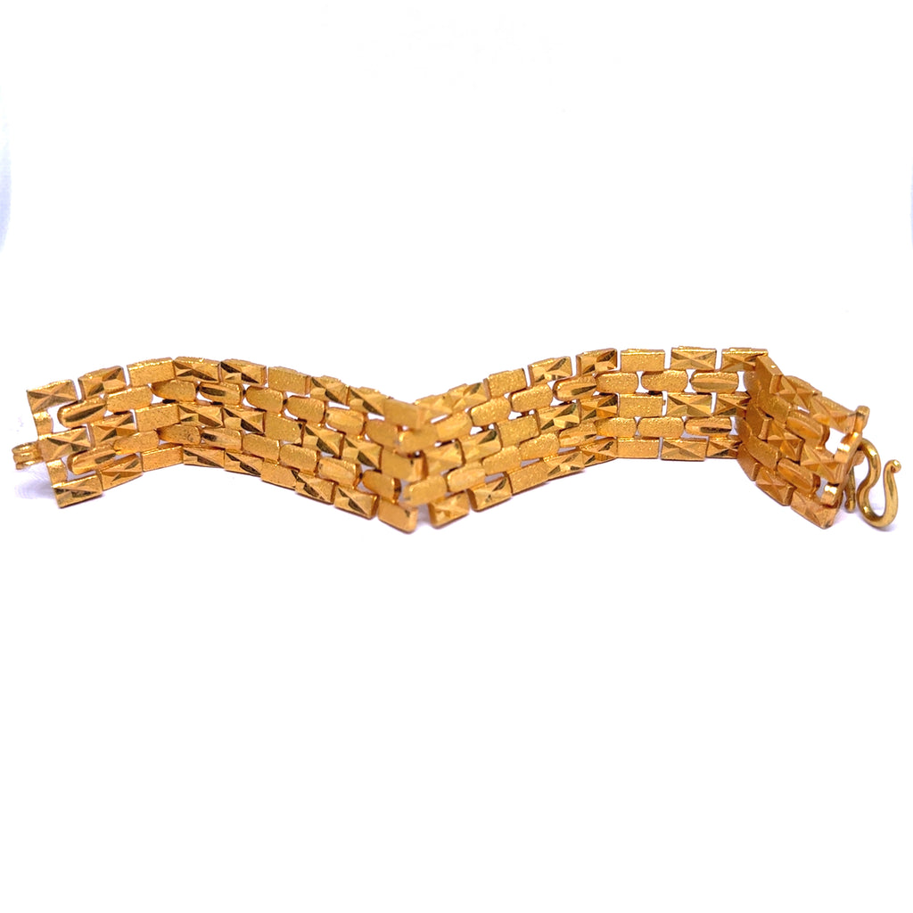 Each geometric link is crafted with subtle surface texture, adding depth and contrast to the bracelet’s smooth, reflective segments. The micron gold plating enhances its rich luster, offering a finish that is both luxurious and long-lasting.